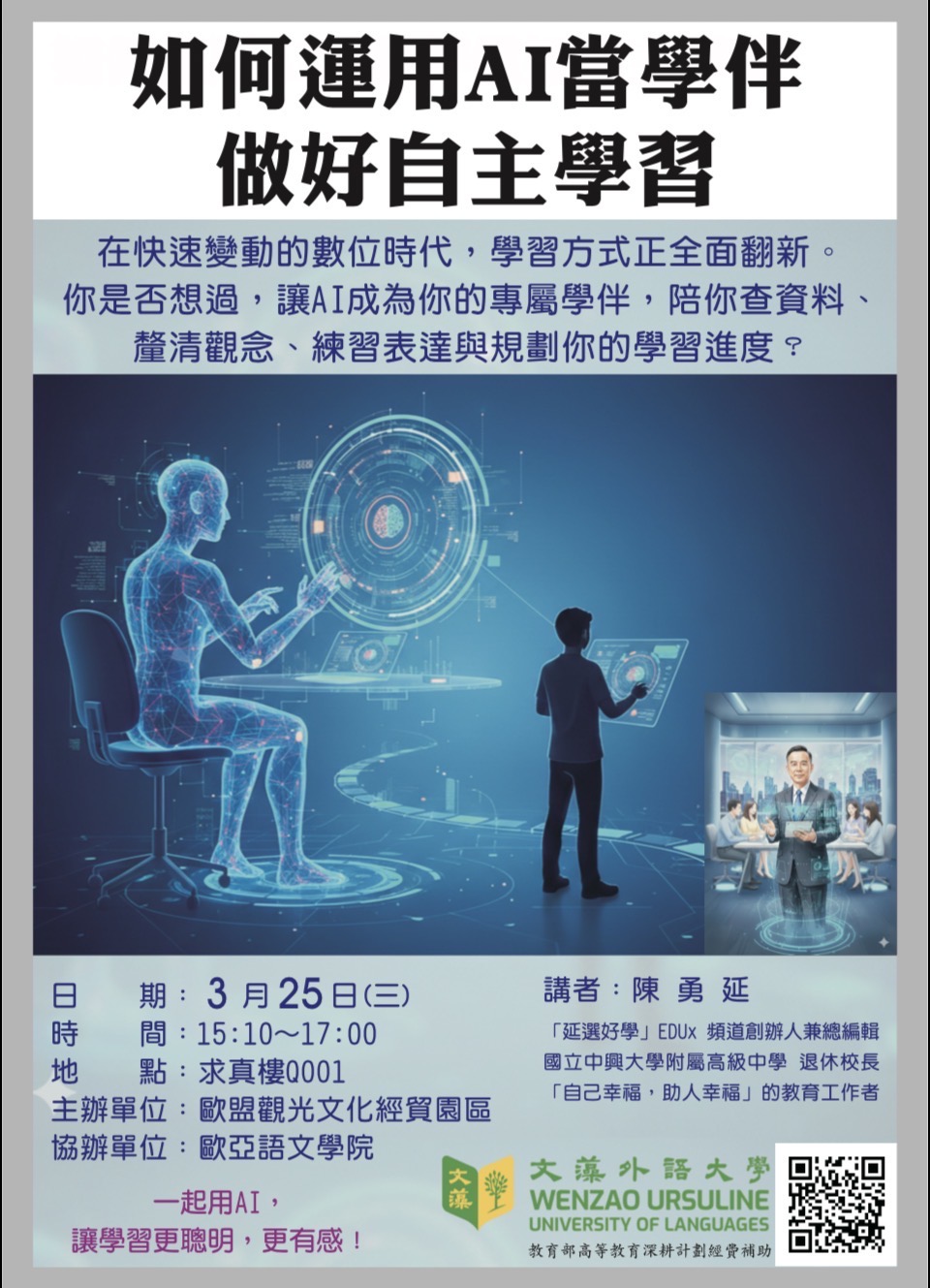 邀請參加歐盟園區專題演講—如何運用AI當學伴做好自主學習(3/25 15:10–17:00)